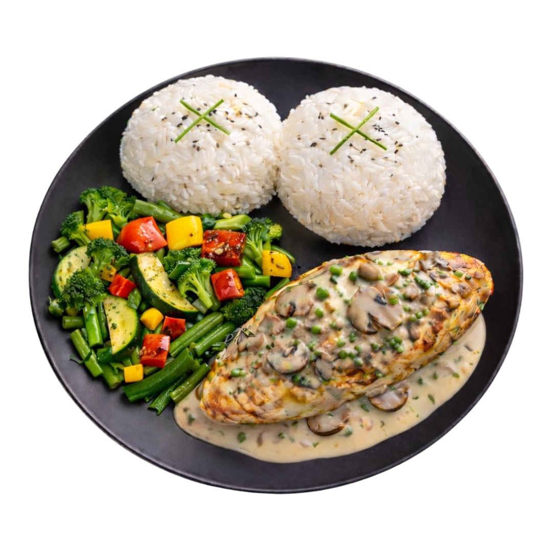 Poulet infusé au thym , riz jasmin , légumes croquants